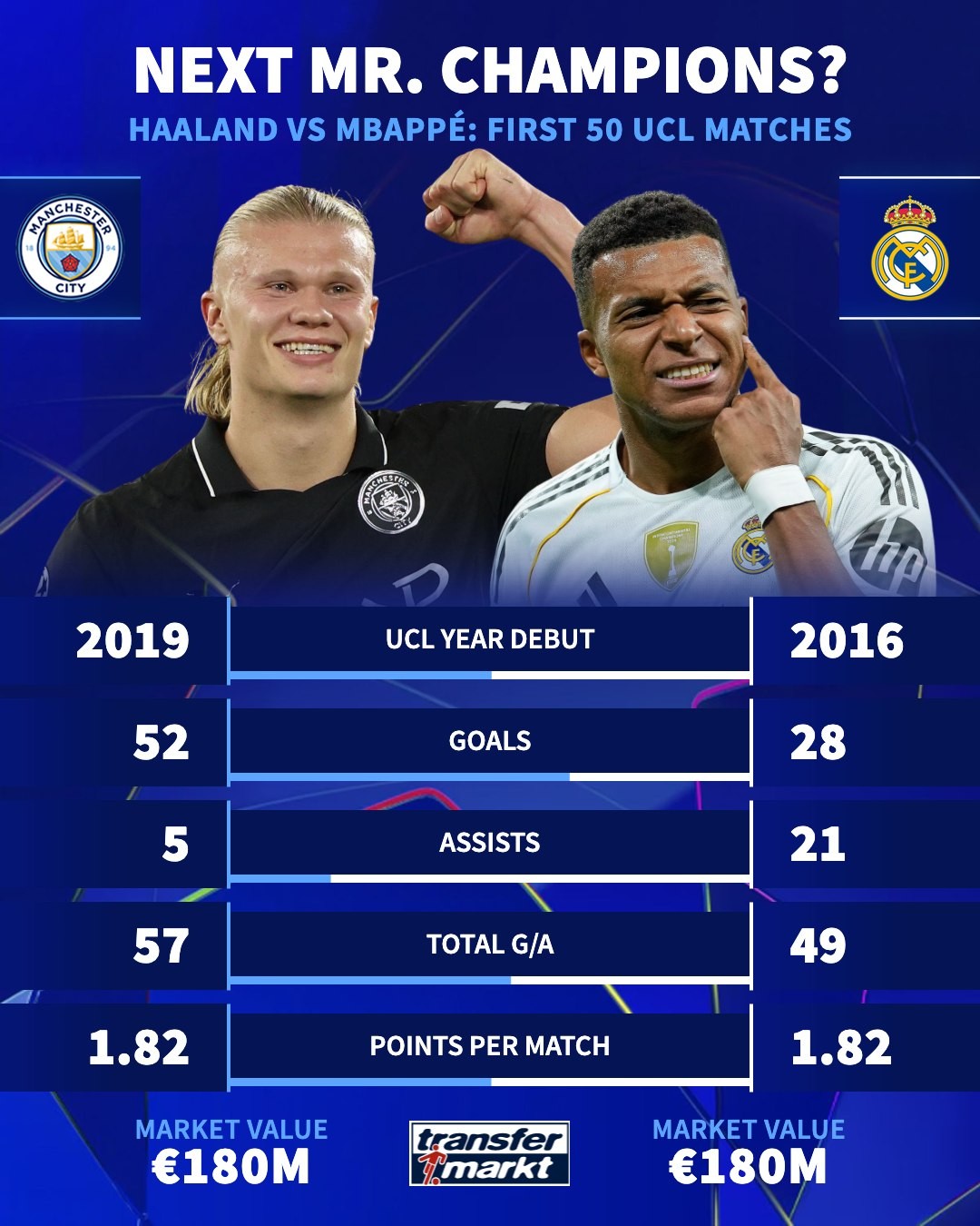 北京时间10月2日,德国转会商场统计了哈兰德与姆巴佩前50场欧冠的数据。