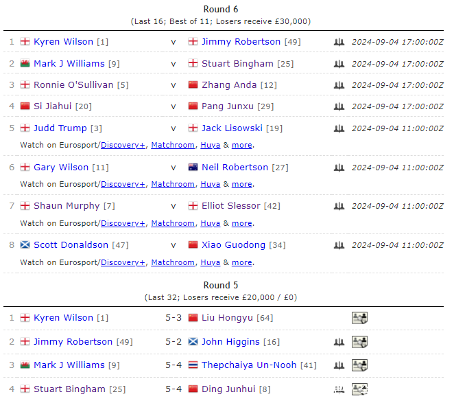 本轮输球的几场比赛的具体比分为:贾德-特鲁姆普5-4逆转吴宜泽、肖恩-墨菲驯顺5-2袁想俊、罗尼-奥沙利文5-1轻取雷佩凡、凯伦-威尔逊5-3驯顺刘宏宇、丁俊晖4-5被斯图尔特-宾汉姆逆转。