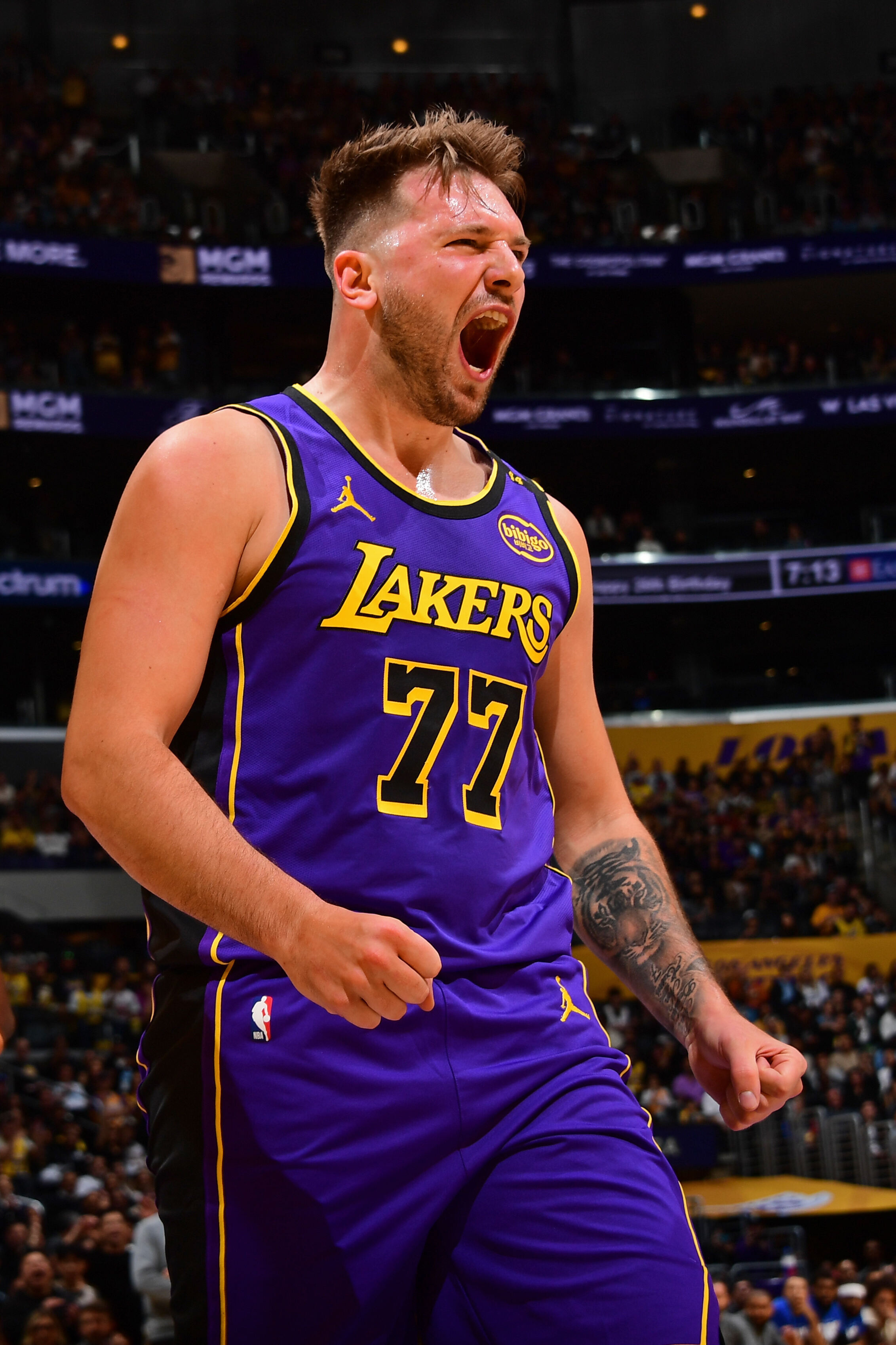 r是以,咱们才能见证东契奇的咆哮——第一节比赛,东契奇情状英勇,指导湖东谈主打停独行侠,开心的他霸气咆哮,此时,他正好正靠近着独行侠总司理尼克-哈里森所在的那片不雅众席。