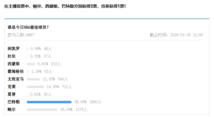 在主播投票中,鲍尔、西蒙斯、巴特勒差别赢得3票,克莱赢得1票!